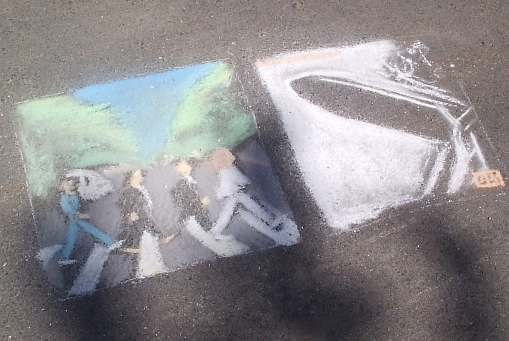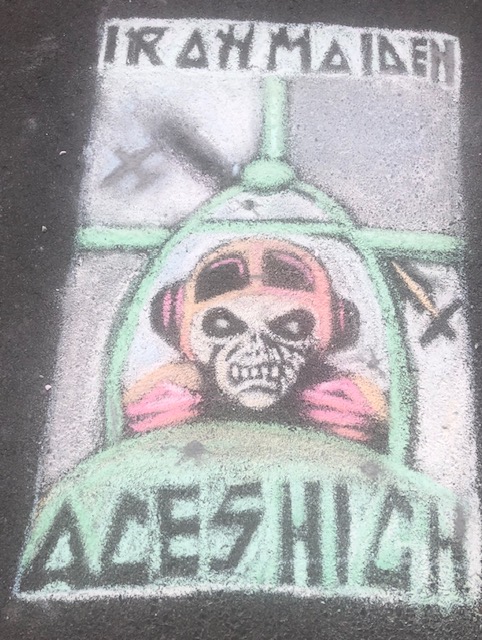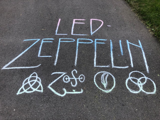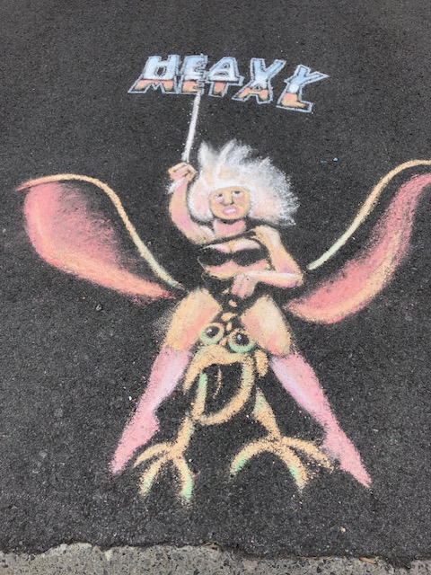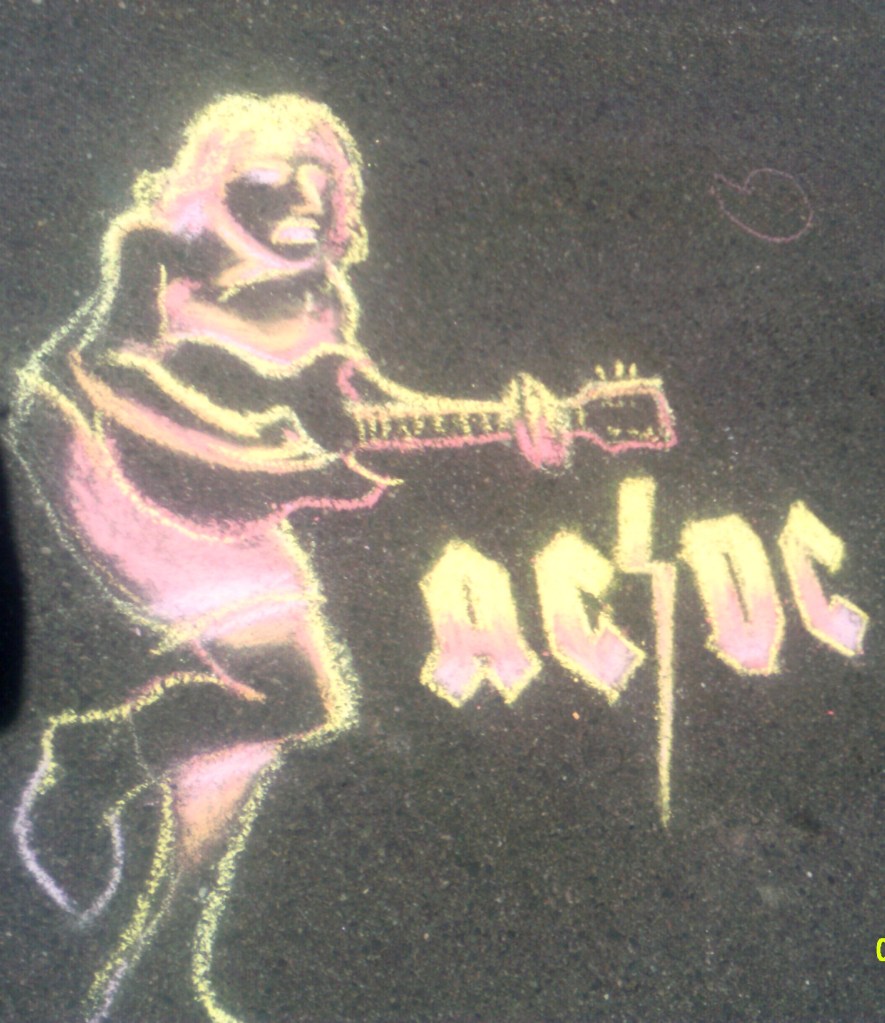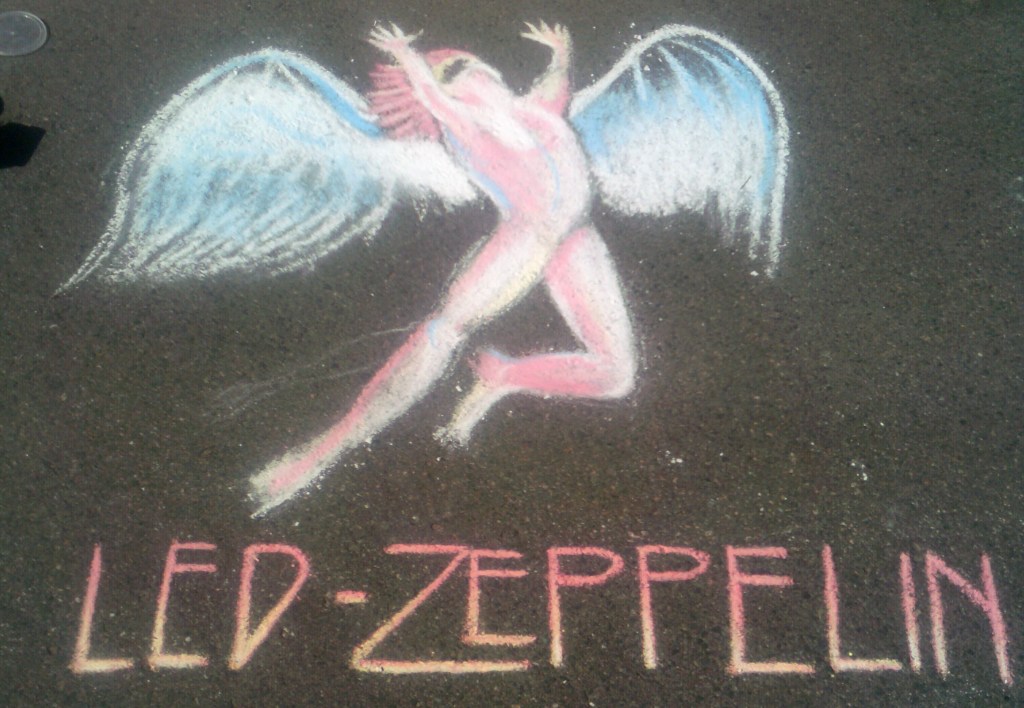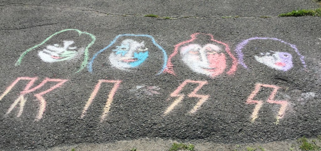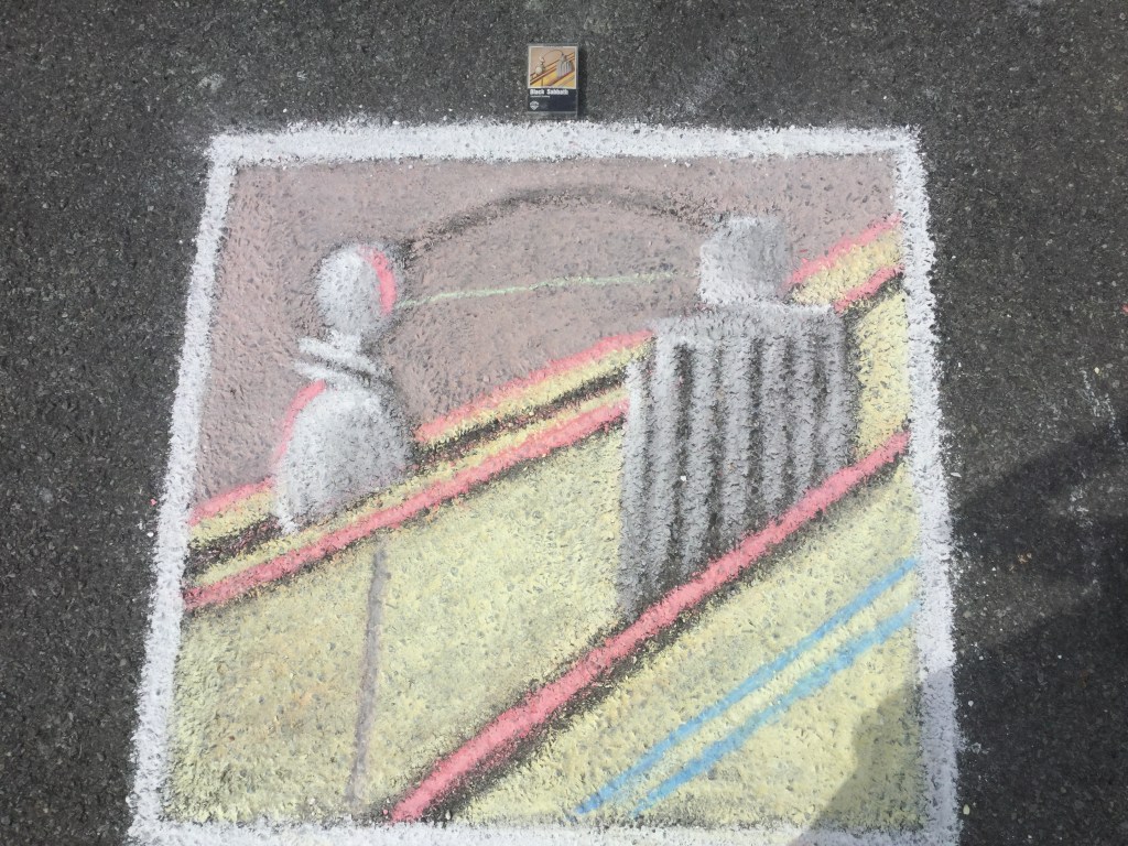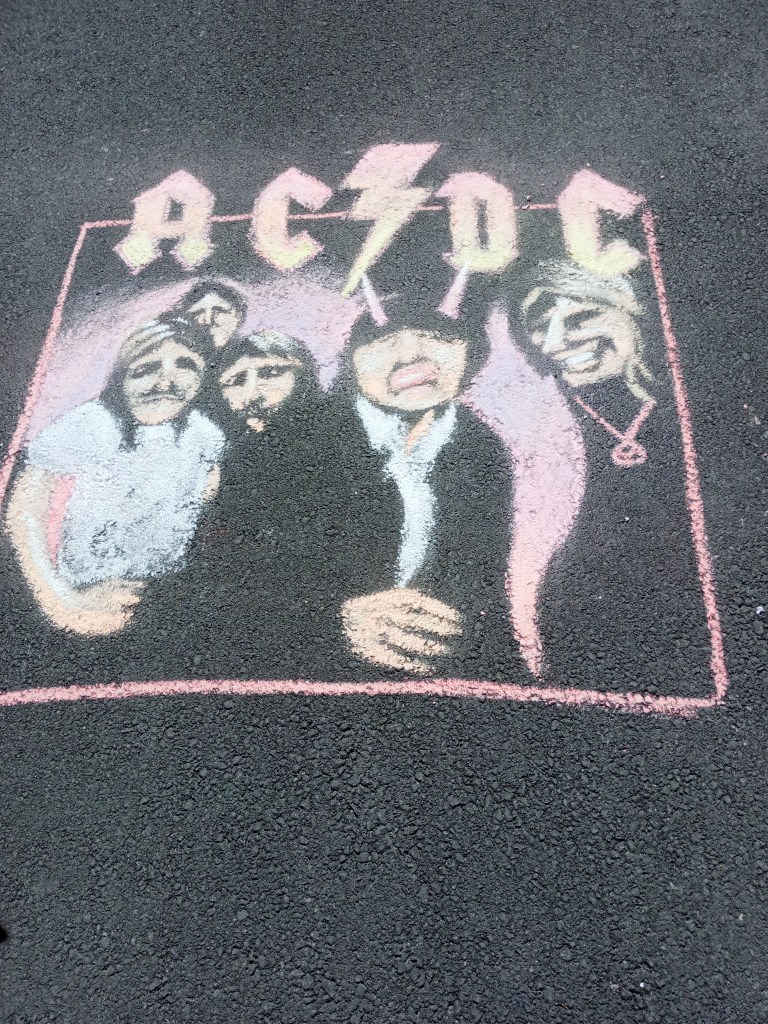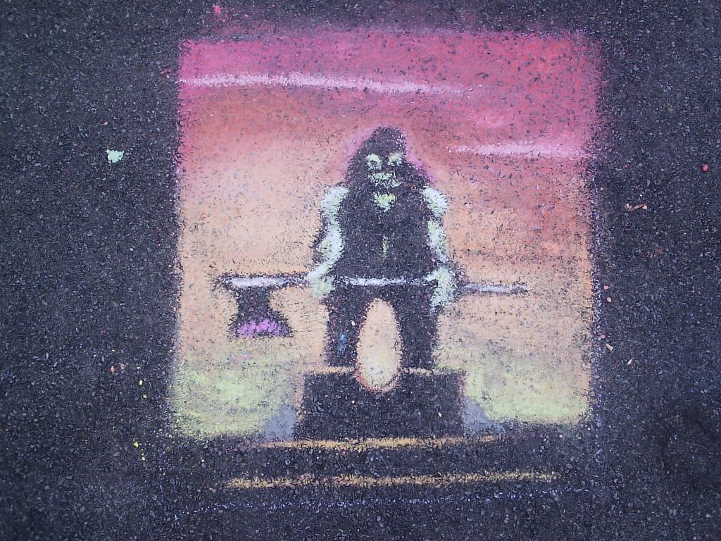 Though I’ve been drawing and painting on paper since I was a small child, for some years I’ve been making chalk art in the driveways and sidewalks in front of my homes. The pictures can provide a little visual enjoyment for neighbors and passersby, and perhaps instill in them some appreciation for band logos, famous record and magazine covers, and classic paintings. Chalk drawing on public or semi-public pavement has a long tradition as folk culture, or even as a form of busking – George Orwell described his encounters with impoverished “screevers” in his 1933 account Down and Out in Paris and London – and in my case it’s a medium that enriches the short seasons when Canadians are not hibernating under snowdrifts. And like corn mazes, ice sculptures, and sandcastles, the impermanence of the finished works adds to their appeal. Chalk it up to experience.