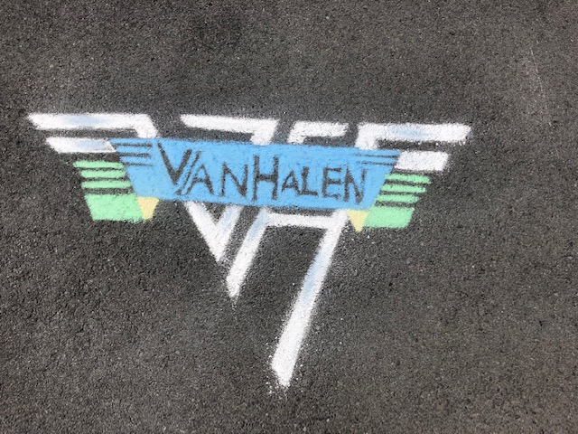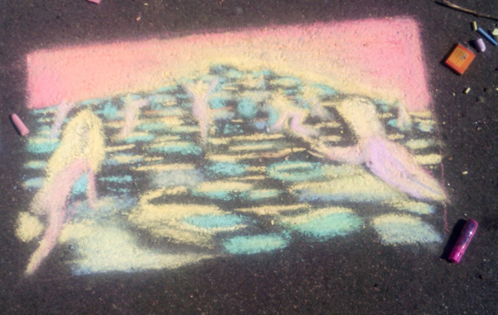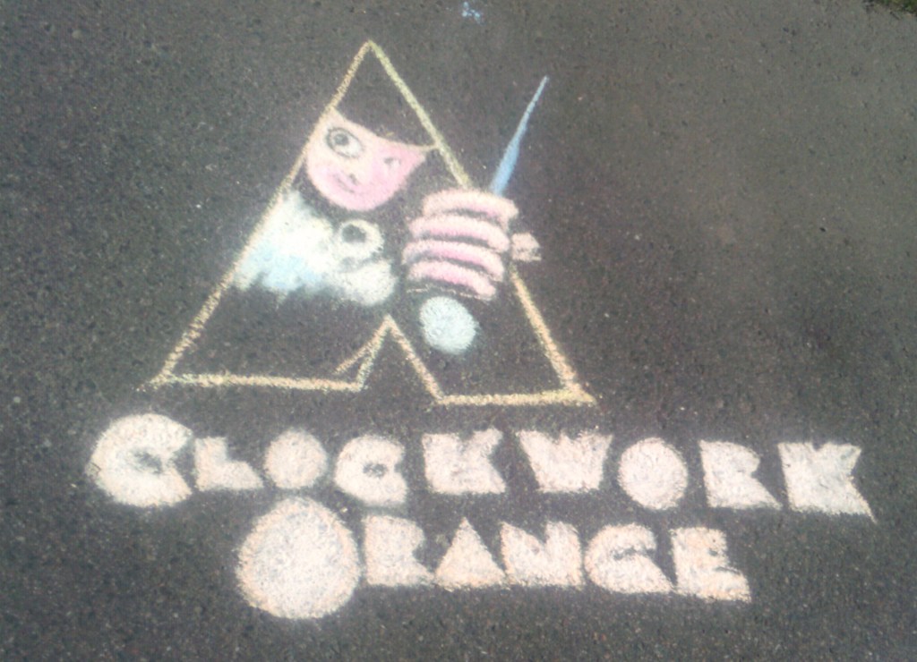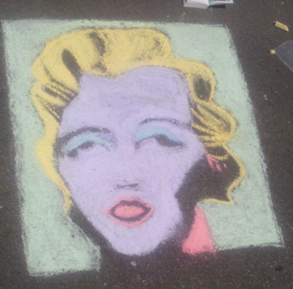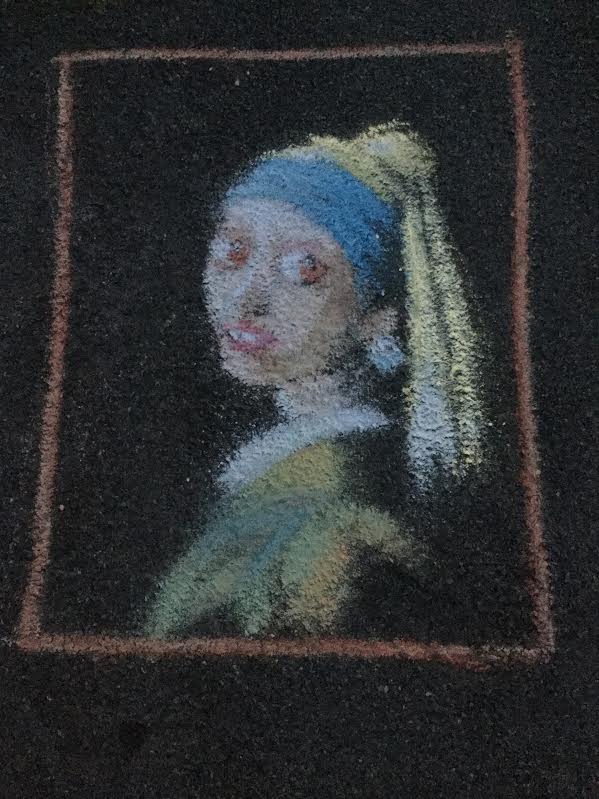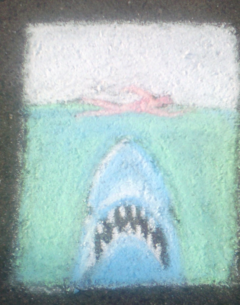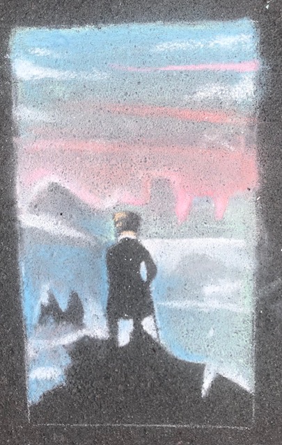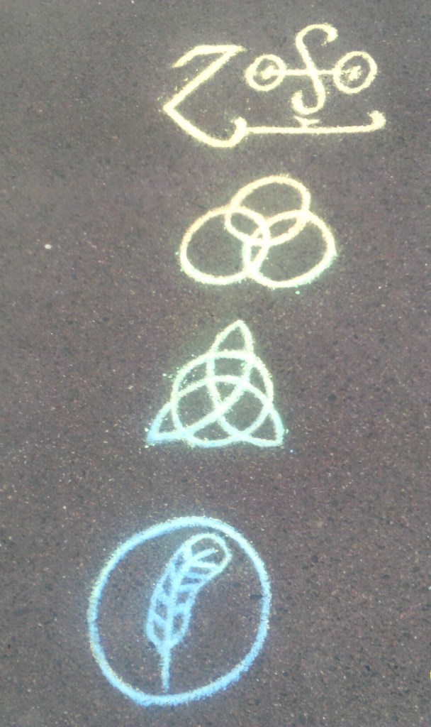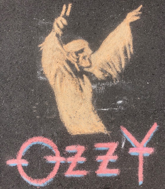 Though I’ve been drawing and painting on paper since I was a small child, for some years I’ve been making chalk art in the driveways and sidewalks in front of my homes. The pictures can provide a little visual enjoyment for neighbors and passersby, and perhaps instill in them some appreciation for band logos, famous record and magazine covers, and classic paintings. Chalk drawing on public or semi-public pavement has a long tradition as folk culture, or even as a form of busking – George Orwell described his encounters with impoverished “screevers” in his 1933 account Down and Out in Paris and London – and in my case it’s a medium that enriches the short seasons when Canadians are not hibernating under snowdrifts. And like corn mazes, ice sculptures, and sandcastles, the impermanence of the finished works adds to their appeal. Chalk it up to experience.