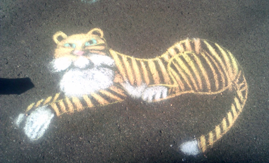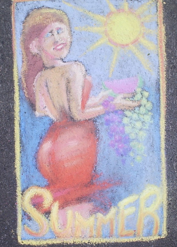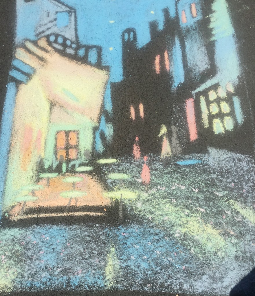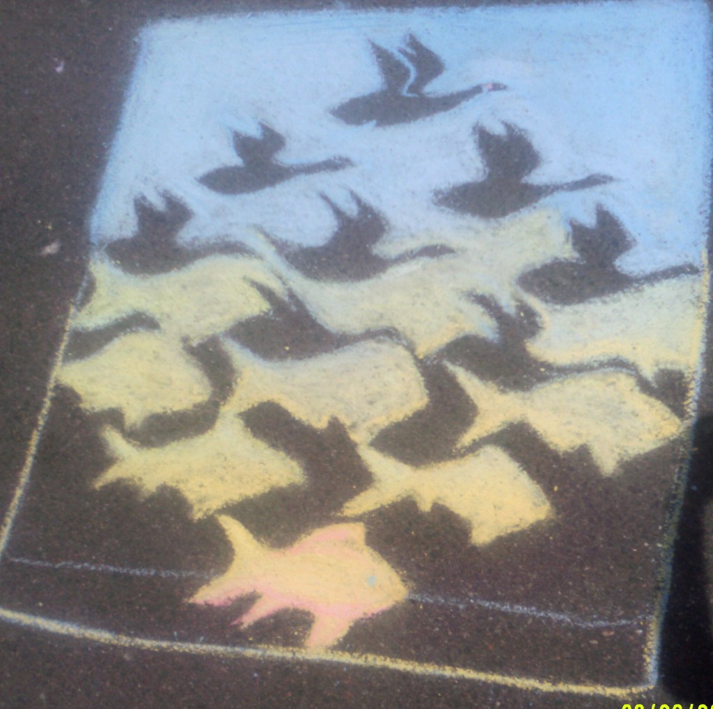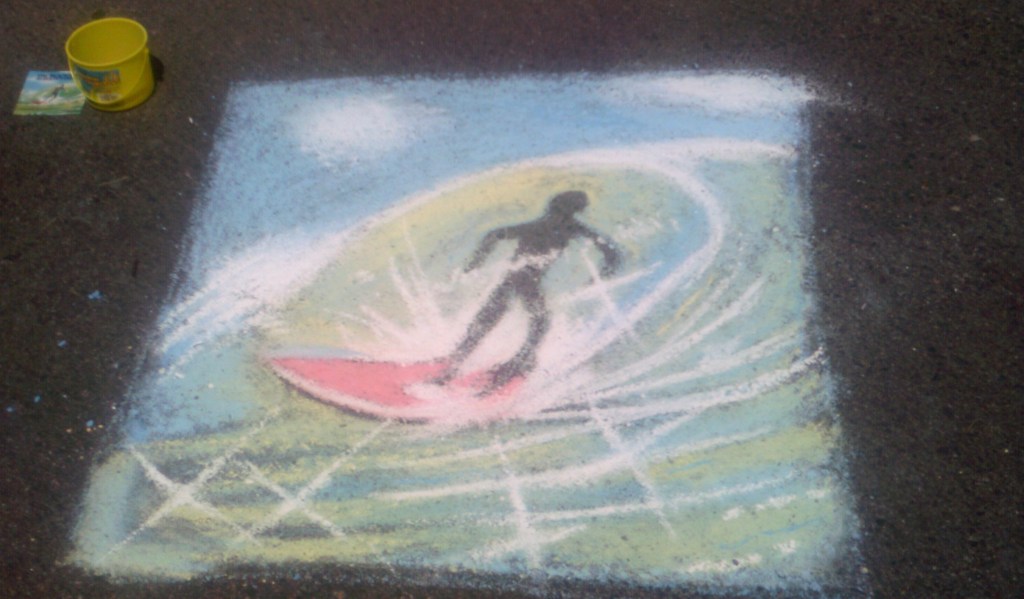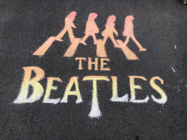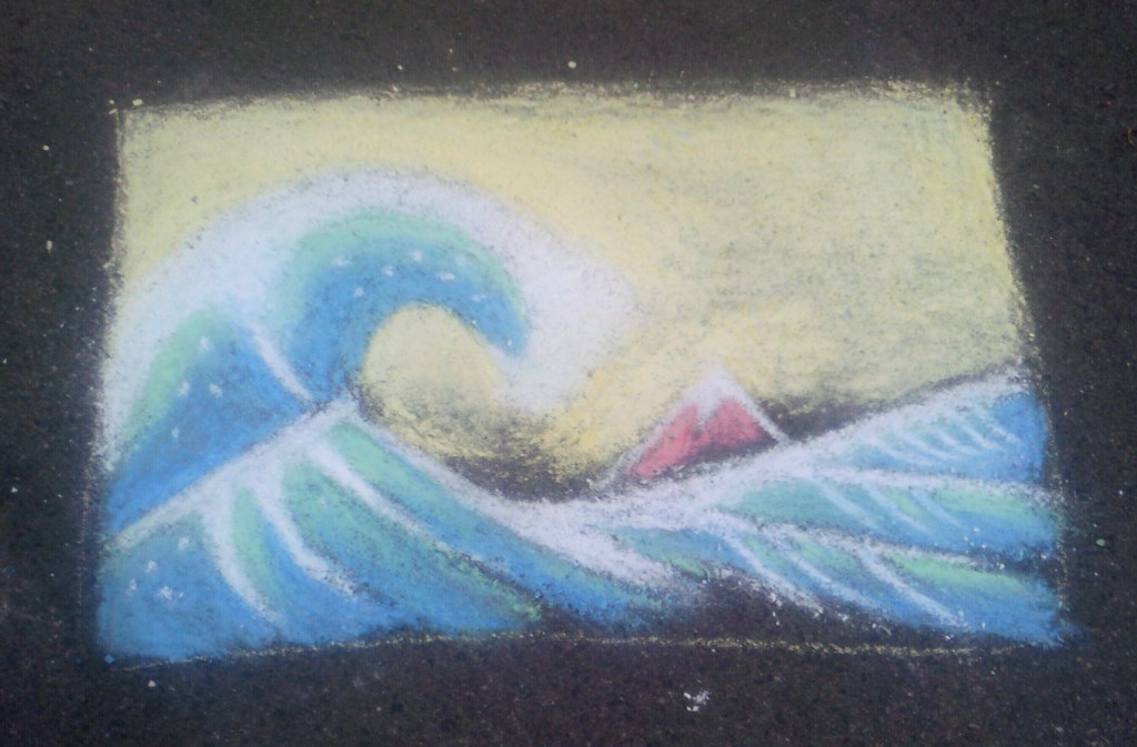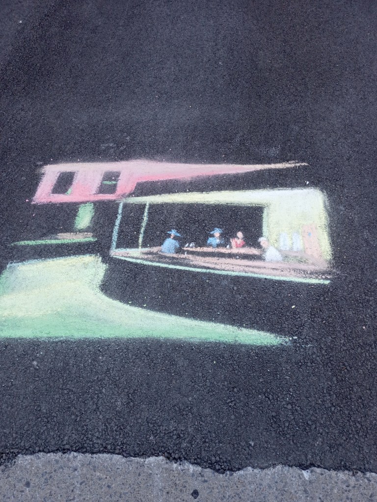 Though I’ve been drawing and painting on paper since I was a small child, for some years I’ve been making chalk art in the driveways and sidewalks in front of my homes. The pictures can provide a little visual enjoyment for neighbors and passersby, and perhaps instill in them some appreciation for band logos, famous record and magazine covers, and classic paintings. Chalk drawing on public or semi-public pavement has a long tradition as folk culture, or even as a form of busking – George Orwell described his encounters with impoverished “screevers” in his 1933 account Down and Out in Paris and London – and in my case it’s a medium that enriches the short seasons when Canadians are not hibernating under snowdrifts. And like corn mazes, ice sculptures, and sandcastles, the impermanence of the finished works adds to their appeal. Chalk it up to experience.