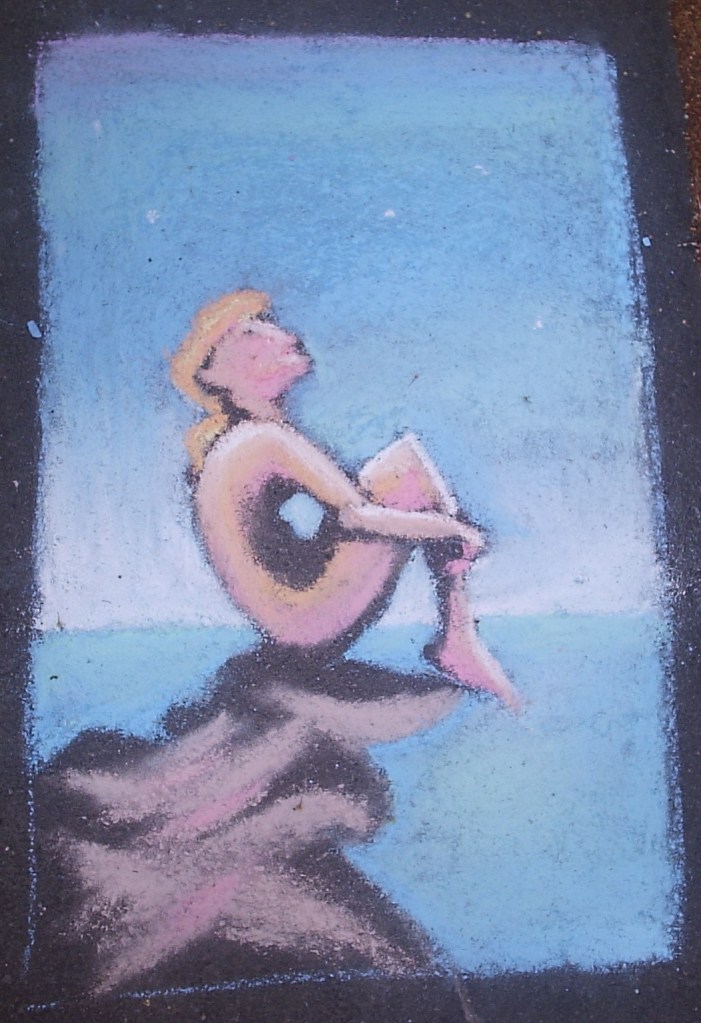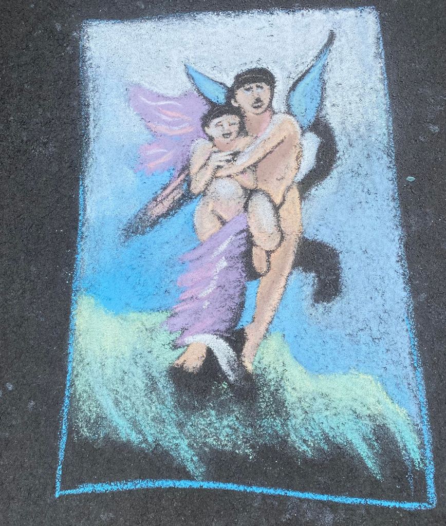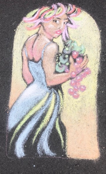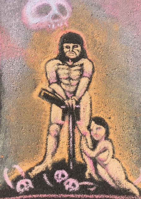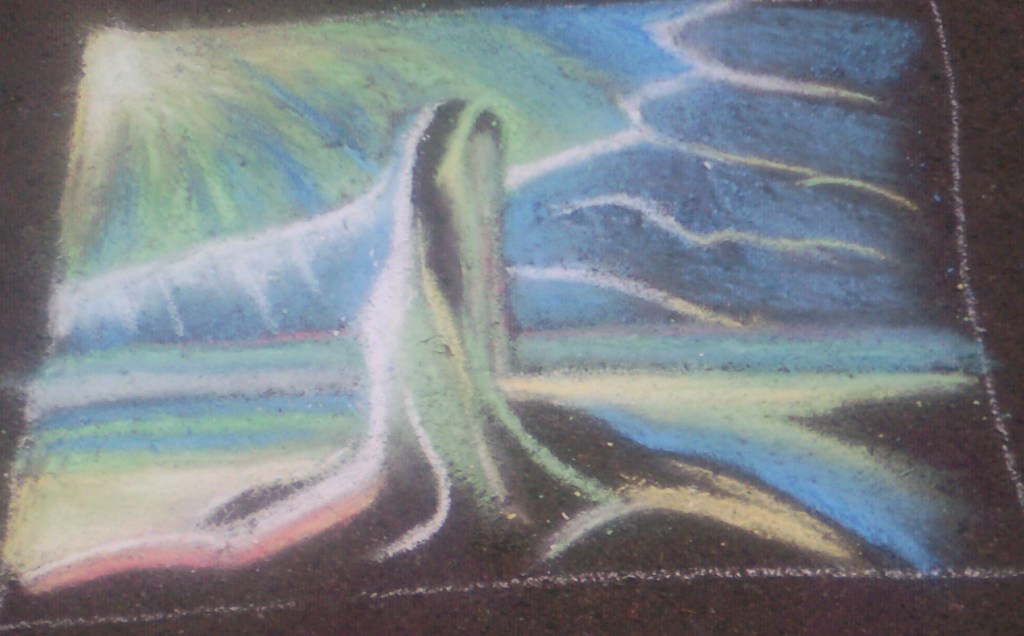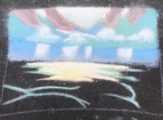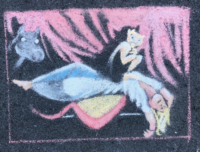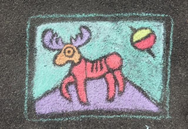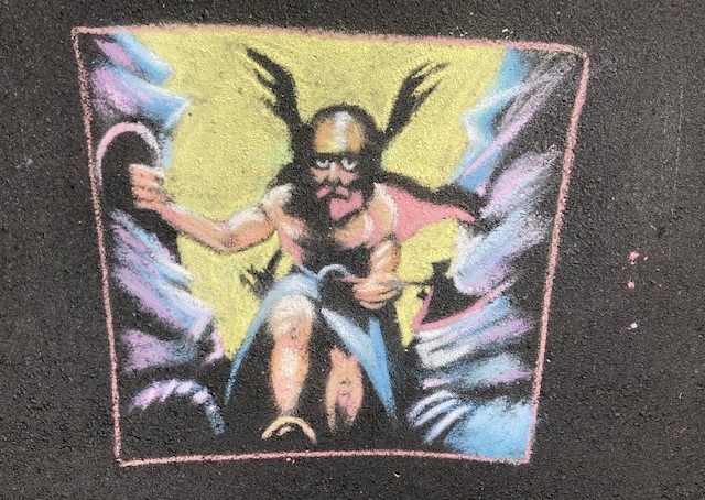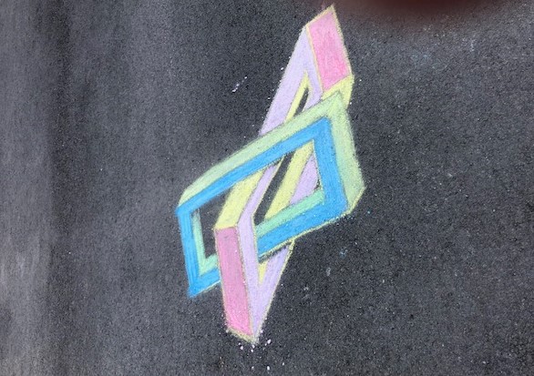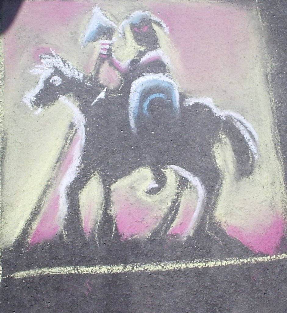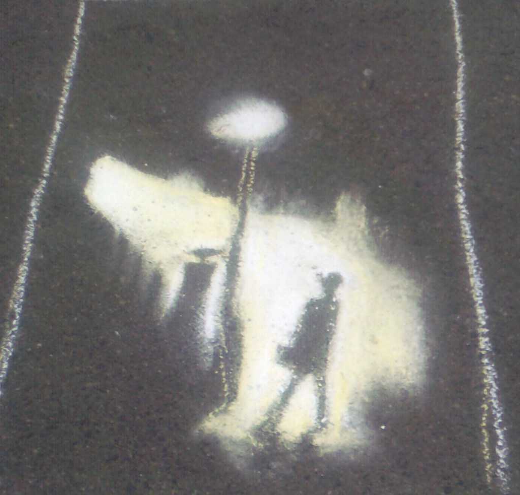 Though I’ve been drawing and painting on paper since I was a small child, for some years I’ve been making chalk art in the driveways and sidewalks in front of my homes. The pictures can provide a little visual enjoyment for neighbors and passersby, and perhaps instill in them some appreciation for band logos, famous record and magazine covers, and classic paintings. Chalk drawing on public or semi-public pavement has a long tradition as folk culture, or even as a form of busking – George Orwell described his encounters with impoverished “screevers” in his 1933 account Down and Out in Paris and London – and in my case it’s a medium that enriches the short seasons when Canadians are not hibernating under snowdrifts. And like corn mazes, ice sculptures, and sandcastles, the impermanence of the finished works adds to their appeal. Chalk it up to experience.